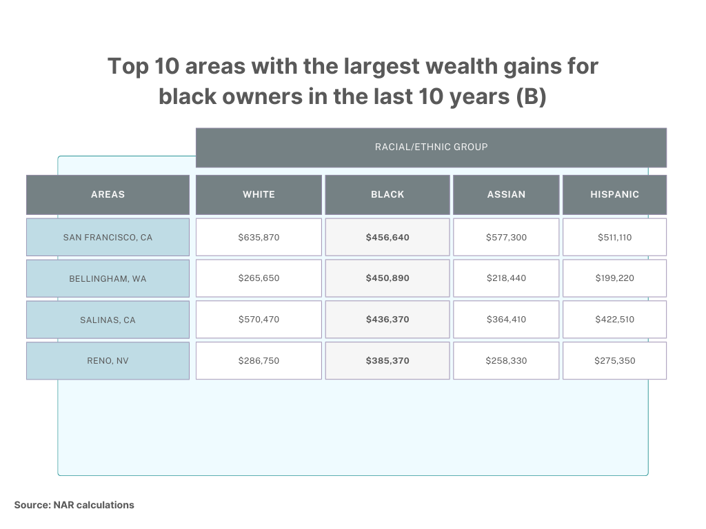 Homeowners in expensive metro areas have experienced some of the most significant wealth gains over the past decade, according to NAR’s report. For instance, in the San Jose metro area, low-income earners accumulated nearly $630,000 in equity over the last 10 years, while middle-income earners gained $643,000. All of the top 10 areas with the largest wealth gains for low-income owners—with equity exceeding $290,000—are located in California.